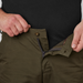 Jeans-knaplukning midt foran D-ring venstre side Skrå forlommer Store lårlommer med velcroopdeler Formskårne knæ Rå længde