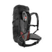 Weitere praktische Details umfassen eine Pakettasche mit Schneeschutz, ein herausnehmbarer Einsatz zwischen Haupt- und Bodenfach, Halterungen für Trekkingstöcke, Lastkontrollriemen, ein verstellbarer Brustgurt, umlaufende Bodenkompression und abnehmbare Seitentaschen mit Kompressionsriemen. Materialschlaufen am Deckel und vorn bieten Platz für weitere Ausrüstung, außerdem integriert: ein Erste-Hilfe-Fach (ohne Inhalt) und ein Schlüsselclip.