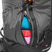 Ein wasserfester, vertikaler Frontreißverschluss erlaubt schnellen Zugriff auf das Hauptfach. Zusätzlich bietet eine große elastische Fronttasche Platz für Helm oder Seil. Außen befinden sich Befestigungsmöglichkeiten für Eispickel oder Stöcke, Materialschlaufen sowie eine funktionale Seilablage.