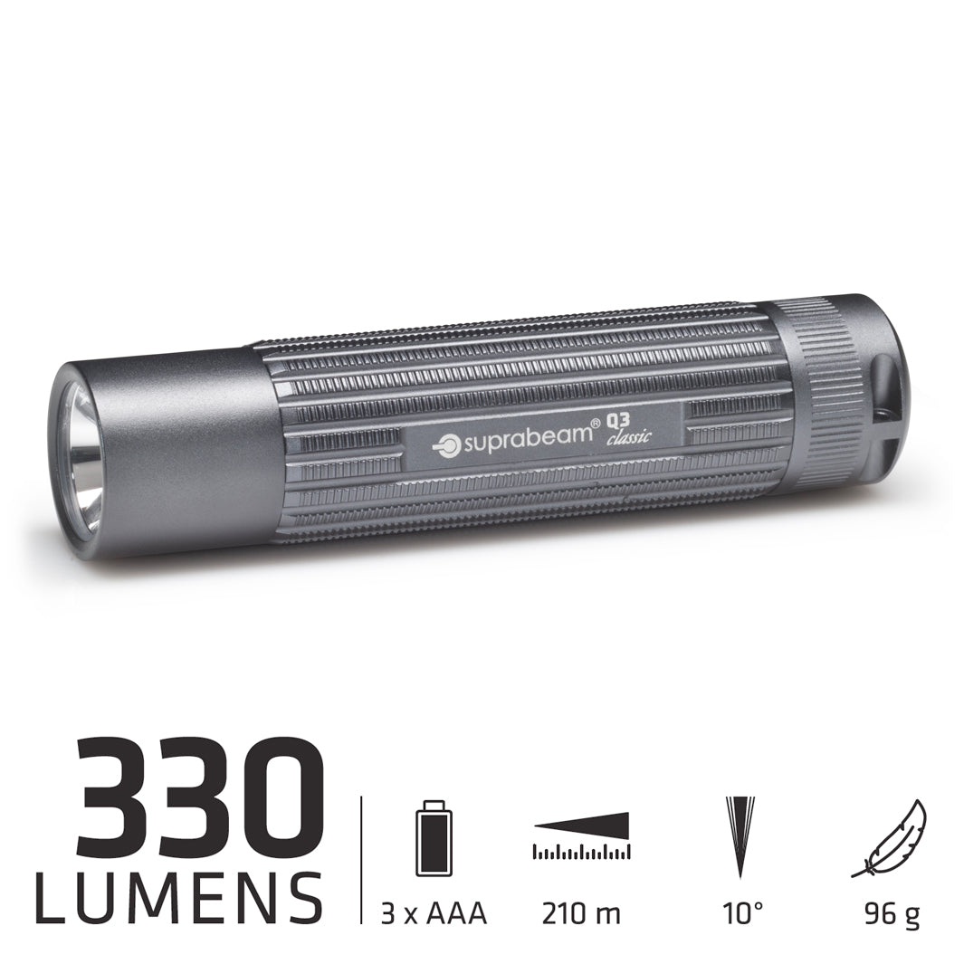 Die kompakte und leistungsstarke Q3classic von Suprabeam überzeugt mit einer festen Lichtstufe und einem robusten Reflektor – ideal für alle, die sich auf klassisches, klares Licht verlassen wollen. Mit nur einem Klick lässt sich die Lampe zuverlässig ein- und ausschalten, was sie besonders bedienfreundlich macht.