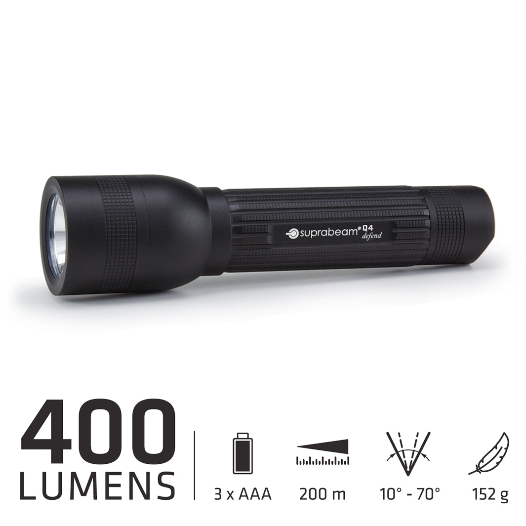 Die Q4 Defend von Suprabeam ist eine kompakte, taktische Taschenlampe mit einer beeindruckenden Lichtleistung von 400 Lumen. Dank der robusten, mattschwarzen Eloxierung und ihrer taktischen Eigenschaften eignet sie sich ideal für Polizei, Sicherheitskräfte und Militär – überall dort, wo Zuverlässigkeit und Mobilität zählen.
