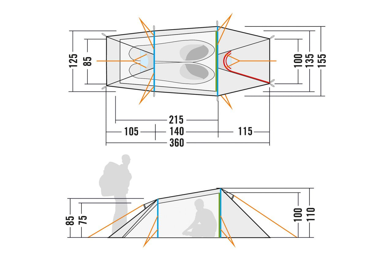 Die leichte und stabile Konstruktion basiert auf zwei Aluminium-Gestängebögen, wobei ein verkürzter hinterer Bogen zusätzlich Gewicht spart. Das Außenzelt besteht aus PU-beschichtetem Polyester mit einer Wassersäule von 8.000 mm und ist farbecht sowie UV-beständig. Der Zeltboden aus PU-beschichtetem Nylon ist mit 10.000 mm Wassersäule besonders widerstandsfähig, während das Innenzelt aus atmungsaktivem Gewebe für gutes Klima sorgt.