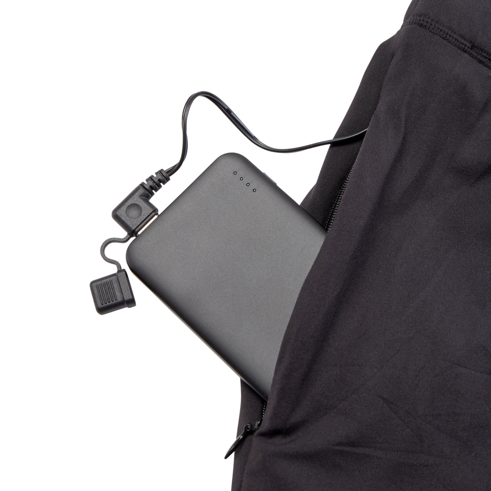 Das weiche, flexible Material liegt angenehm auf der Haut und macht jede Bewegung mit. Ein kurzer Reißverschluss am Halsausschnitt erleichtert das An- und Ausziehen, während die integrierte Tasche sicher Platz für die Powerbank bietet.
