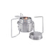 Der Spirituskocher fasst 120 ml, misst 7,5 x 5,5 cm und wiegt nur 95 g. Die Flammenreguliervorrichtung sorgt für präzise Hitzeeinstellung, bei kompakten Maßen von 7,65 x 2,5 cm und einem Gewicht von 30 g. Der stabile Ständer ist 7,5 x 3 cm groß und bringt lediglich 85 g auf die Waage.
