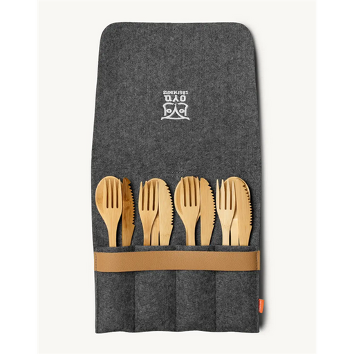 Bambusbesteck, das alle Bedürfnisse beim Essen in der Natur erfüllt. Inklusive Filztasche zum geschützten Verstauen. Set für 4 Personen