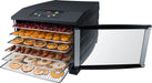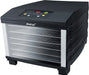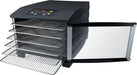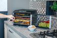 Technische Daten: 6 Roste aus Edelstahl, Größe 370 x 300 mm. Temperatureinstellung 35–90 °C. Timer bis zu 24 Stunden. Inklusive Matte für Kräuter.